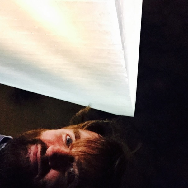 A man with a beard, mustache and longish hair is looking into the camera in dark room.