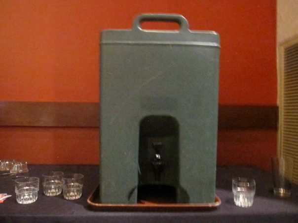 A water cooler sitting on a brown tray with several glasses around it.