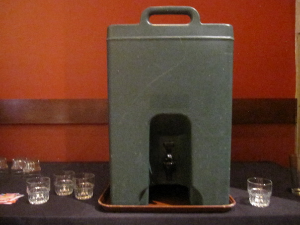 gray water dispenser on a purple table with glasses with water