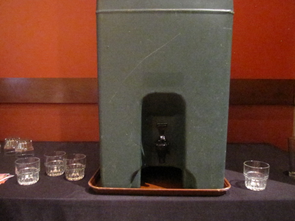 A large plastic hotel water station on a tray, surrounded by several glasses
