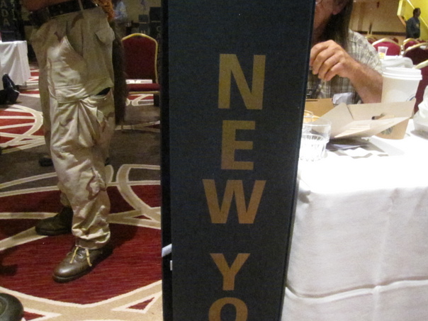 The state of New York is represented by a woman attending s political convention.