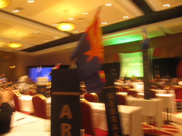 A dimly-lit banquet hall has only a few people seated in red chairs in front of tables decorated with flags and the names of various US states.