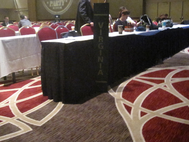 This is a photo of what appears to be a conference room filled with mostly empty chairs and a sign that says "Virginia".