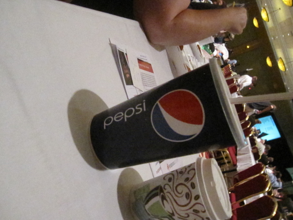 This is a picture that someone took at a conference of their drinks, one is coffee and one is a pepsi.