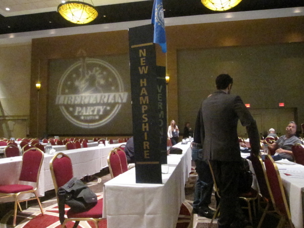 A few attendees in fray and black business are at a Libertarian conference with long white cloth covered tables and maroon chairs.