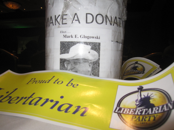 The sign is saying make a donation to a guy named Mark E. Glogowski.