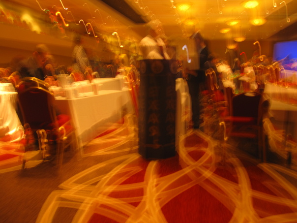 This is a very blurry photo of tables and people at a wedding or other social event.
