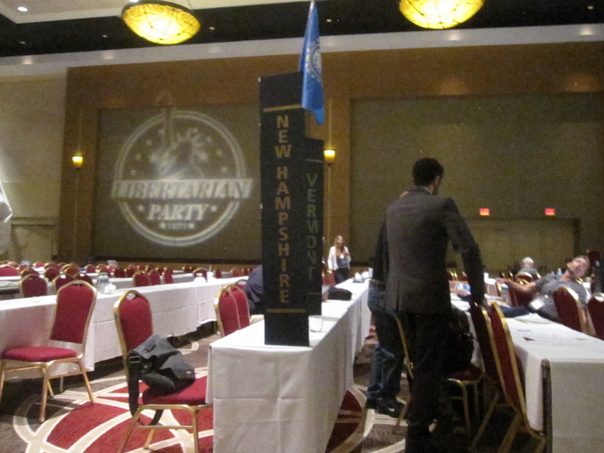 A sign reading "Libertarian Party" is projected on the wall in front of tables listing states.