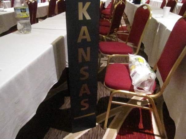 A sign stating kansas with a subway bag on the chair next to it in some sort of ballroom.