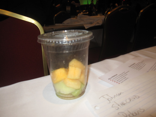 There is a clear cup of fruit sitting on a table.