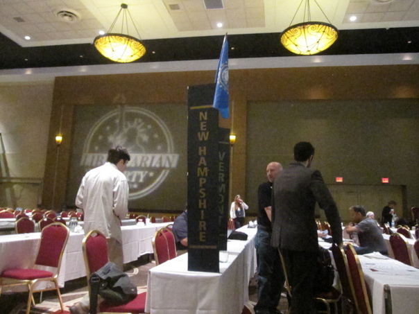 A libertarian state convention takes place with many chairs and long tables to seat the participants.