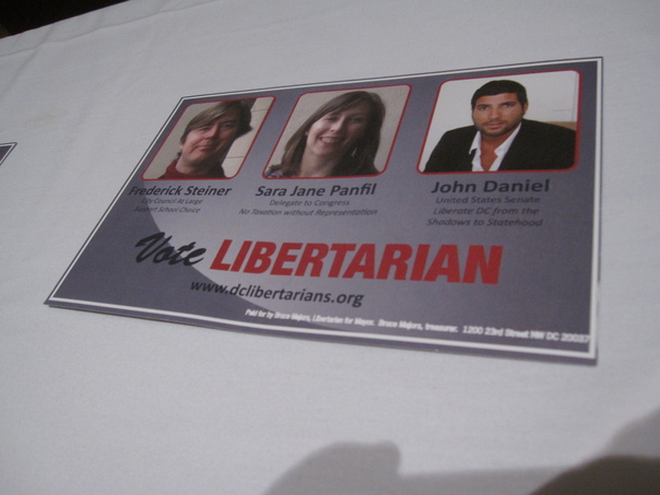A large gray flyer that has three individuals on there and the words Vote Libertarian.