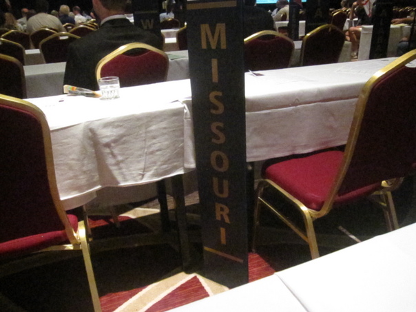 The table with a white cloth that is surrounded with red chairs with a Missouri sign next to the middle chair.