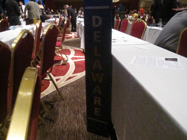 There is an auditorium of red chairs and the picture focuses on a sign that says Delaware on it.