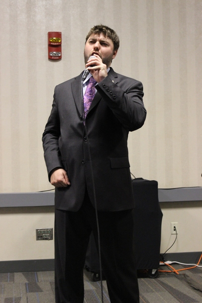 A young man wearing a black dress suit and purple tie speaks passionately into a microphone.