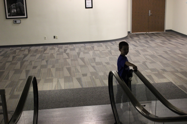 A little boy amuses himself by pretending an escalator handrail is a racetrack.