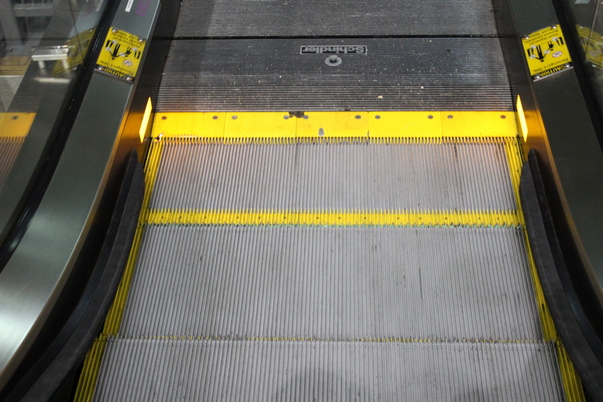 The shiny metallic escalator has brightly colored yellow paint across the bottom to alert riders as to where the moving steps begin.