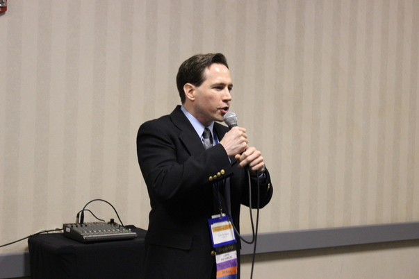 Brunette man in a suit and tie holding a microphone in both hands to his mouth.