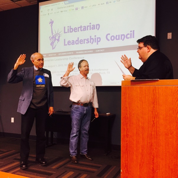 Two men are sworn in to leadership positions at the Libertarian party's annual convention.