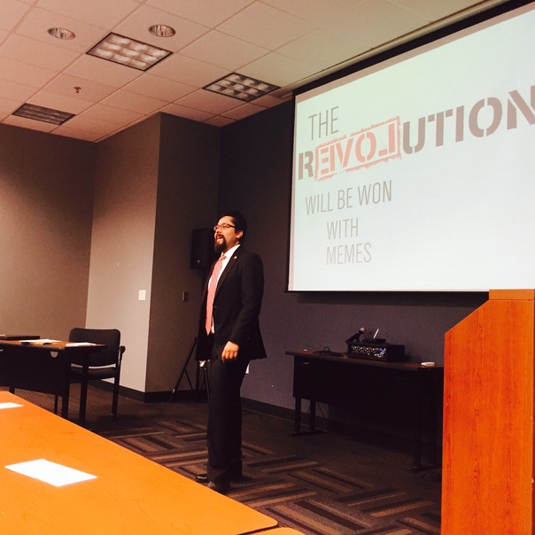 A bearded man wearing a black suit is speaking in front of a projector screen that says "The Revolution will be won with memes".