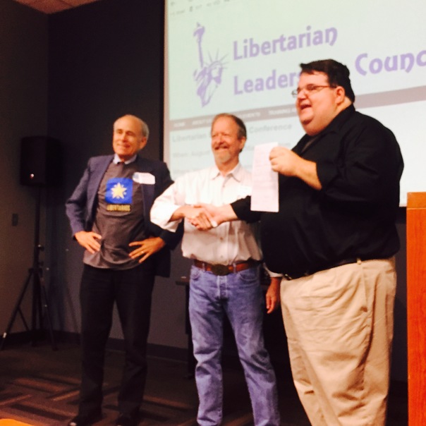 Two men are shaking hands while a third man stands beside them next to a projector screen that says "Libertarian Leadership Council".