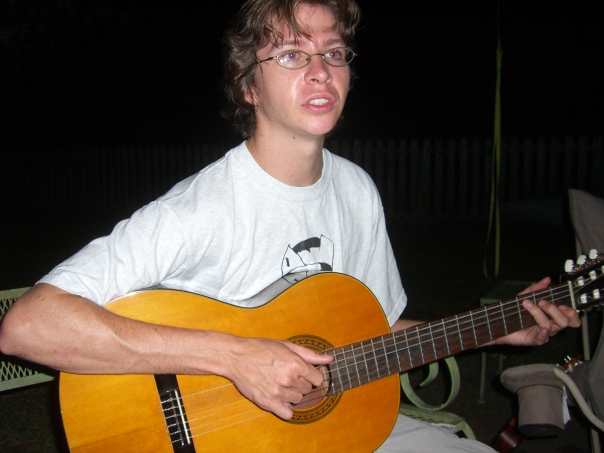 early 30's male playing folk guitar wearing tee shirt with graphic
