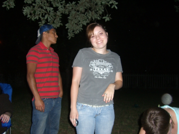 A young man and woman are standing outside at night, they are with several other people who are seated and there is a tree behind them.
