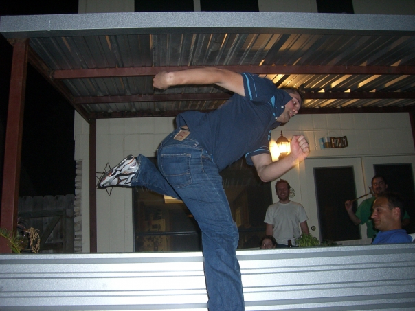 ![]() LaViolette After Rehearsal Party Austin, TX After Dreux and Amy's rehearsal dinner out at The County Line (on 2244), we headed over to the Crockett's house for some further drinking and partying. For some reason someone (most likely Crockett) came up with the idea of jumping over this piece of sheet metal left over from the Crockett's roofing. We were effectively trying to jump it like a hurdle, and slightly later like a high jumper. Fortunately nobody was injured, but in hindsight, it probably wasn't the best thing to be doing the day before a friend's wedding. ...especially when one of the participants was the best man. |