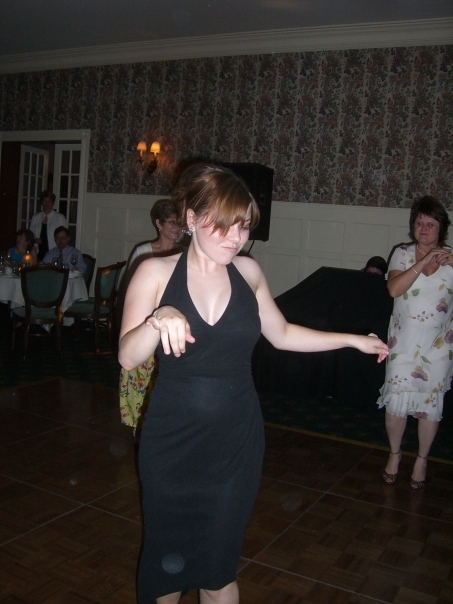 girl in black dress dancing with people in background of room.