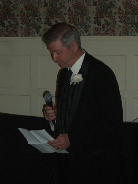 an older man, probably a father at his daughters wedding, holding a microphone and a piece of paper. he's got a mustache ;)