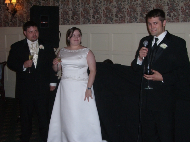 Best man making a speech at a wedding with the bride and groom holding champagne glasses.