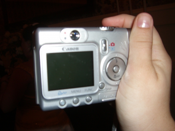 a hand holding a camera with a screen and buttons