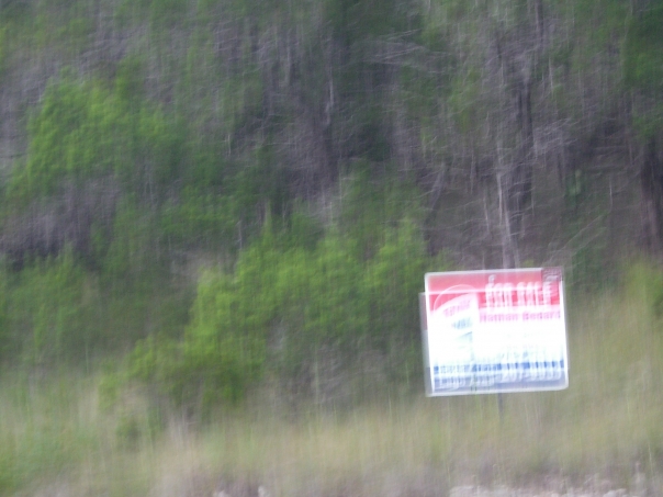 A blurry re/max for sale sign taken through the window of a moving car against a forest background.