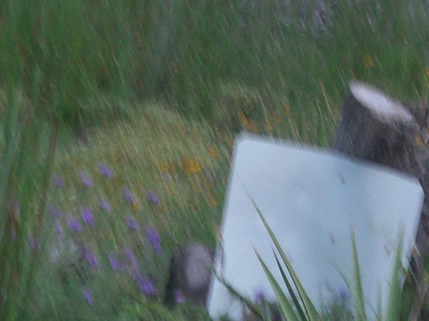 Fuzzy picture of outside with a paper and a log and grass.