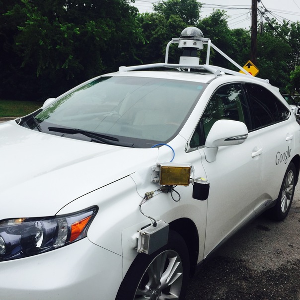 a google logo is on a white car with some sort of electronic device sitting on the side of the car.