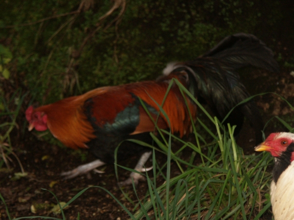A majestic orange and green colored rooster pecking at the ground looking for his next meal.