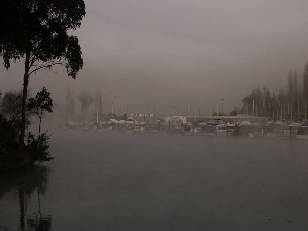 A foggy gray picture of a marina with trees in the foreground and background