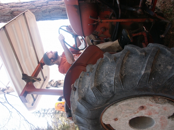 A bearded white guy driving a large red tractor in an orange shirt and gray cap.