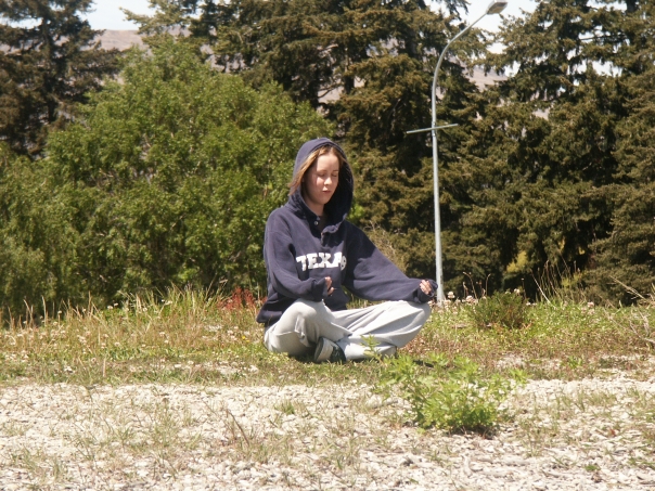 A women is doing yoga with her jacket on the ground in sun