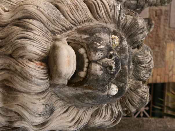 a statue of lion with large mane and open mouth and visible teeth and nostrils