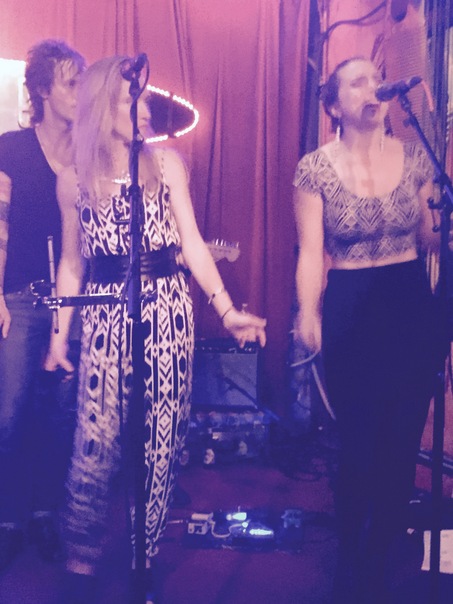 There are a few people on stage, two women performing vocally with a musician behind them.