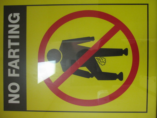 A yellow sign with a black bar at the top with "NO FARTING" in bold white letting. Below the black bar is a black block figure within a bold red circle bisected hemisphericly from the top left to the lower right. The figure is standing on it's left foot with it's left foot raised. A 'poof', indicating a gaseous emanation is located at the point where the figure's legs meet it's body. The sign has been tilted ninety degrees so that the top is facing the viewer's left, and the bottom the right.