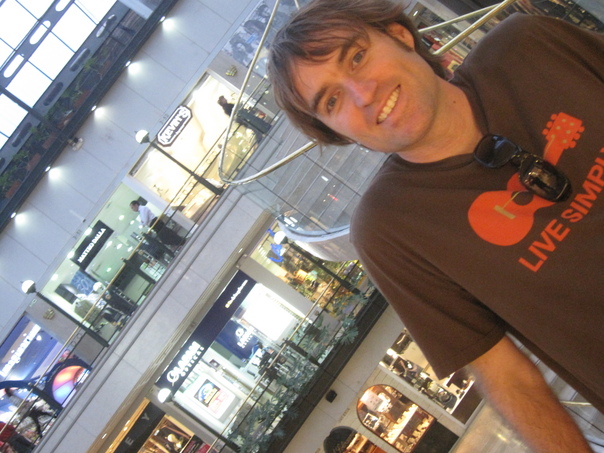 A MAN WEARING A TSHIRT IS POSING INSIDE OF A SHOPPING MALL.