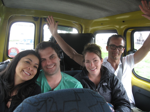 Two happy couples in a yellow taxi van traveling together.