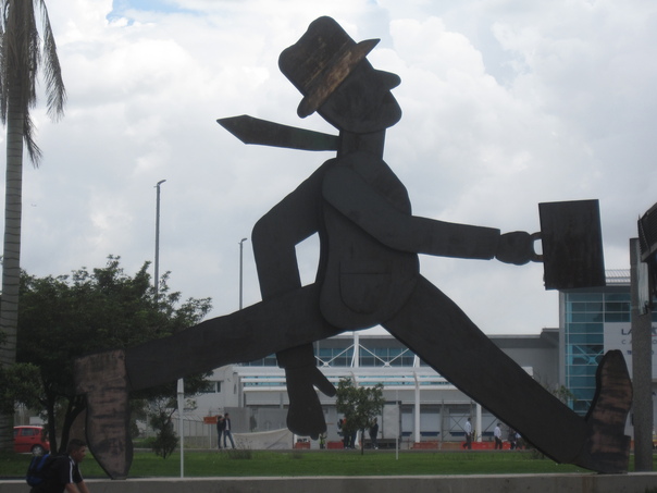 This is an immense statue of a tall lanky businessman rushing to work.