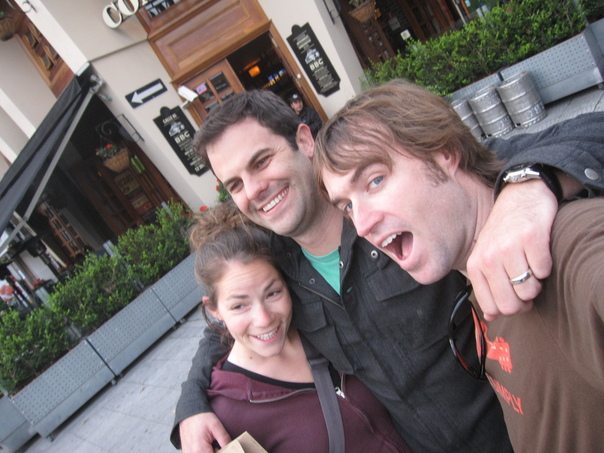 A woman and two men smile for the camera in a public setting.