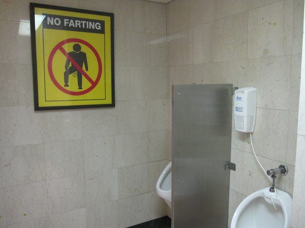 THE YELLOW SIGN IS AN IRONIC MESSAGE IN THE CLEAN BOYS' BATHROOM.