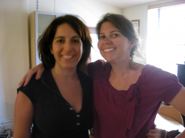 two women smiling one wearing a red shirt and the other wearing a black v neck.