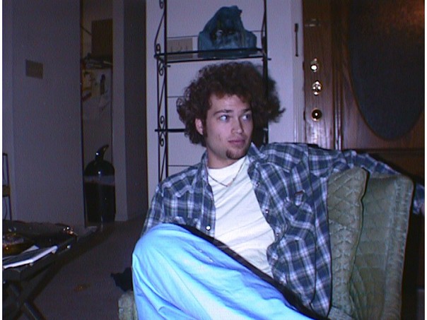 The man with brown curly hair is wearing a blue plaid shirt, a white tshirt and blue pants and sitting on a green fabric chair. |