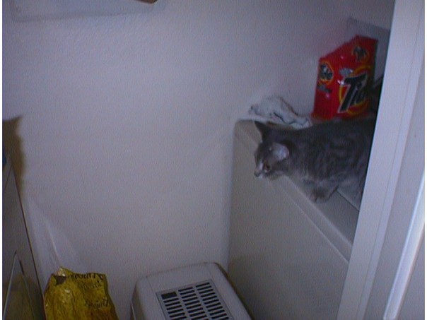 This is a grey cat sitting on top of a washer or dryer, with Tide detergent behind him and a cat carrier on the ground. |